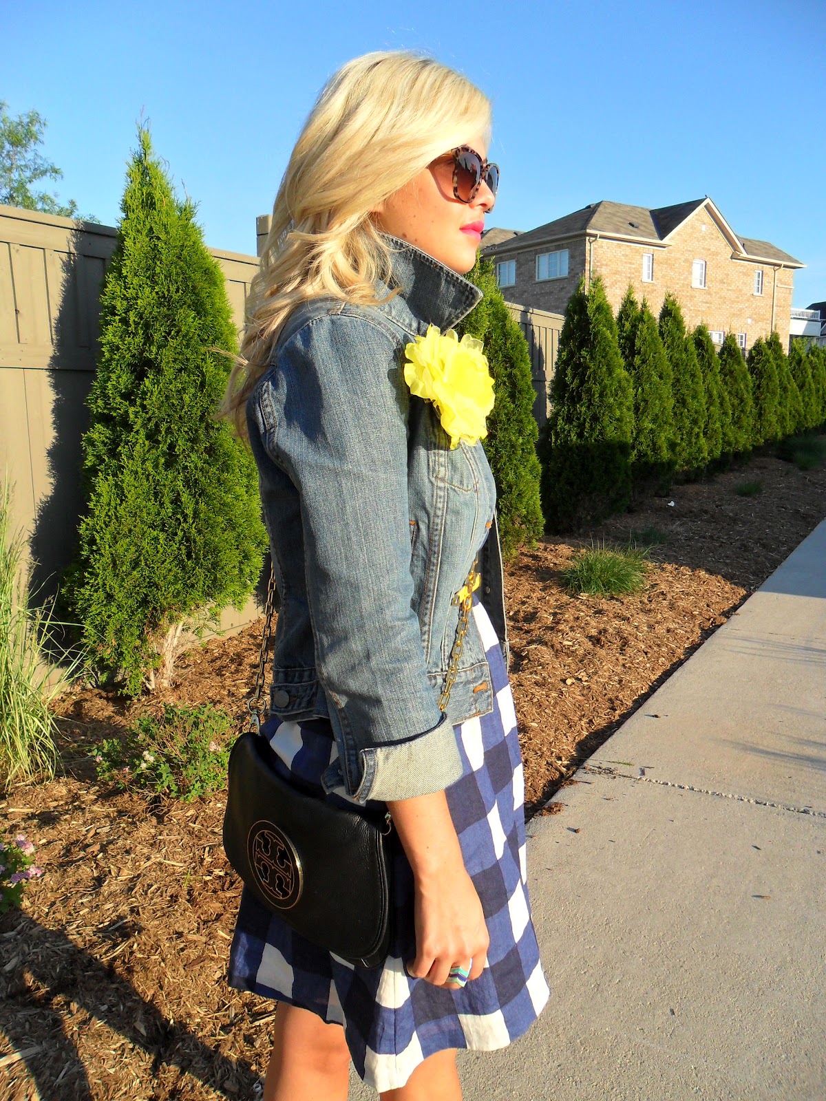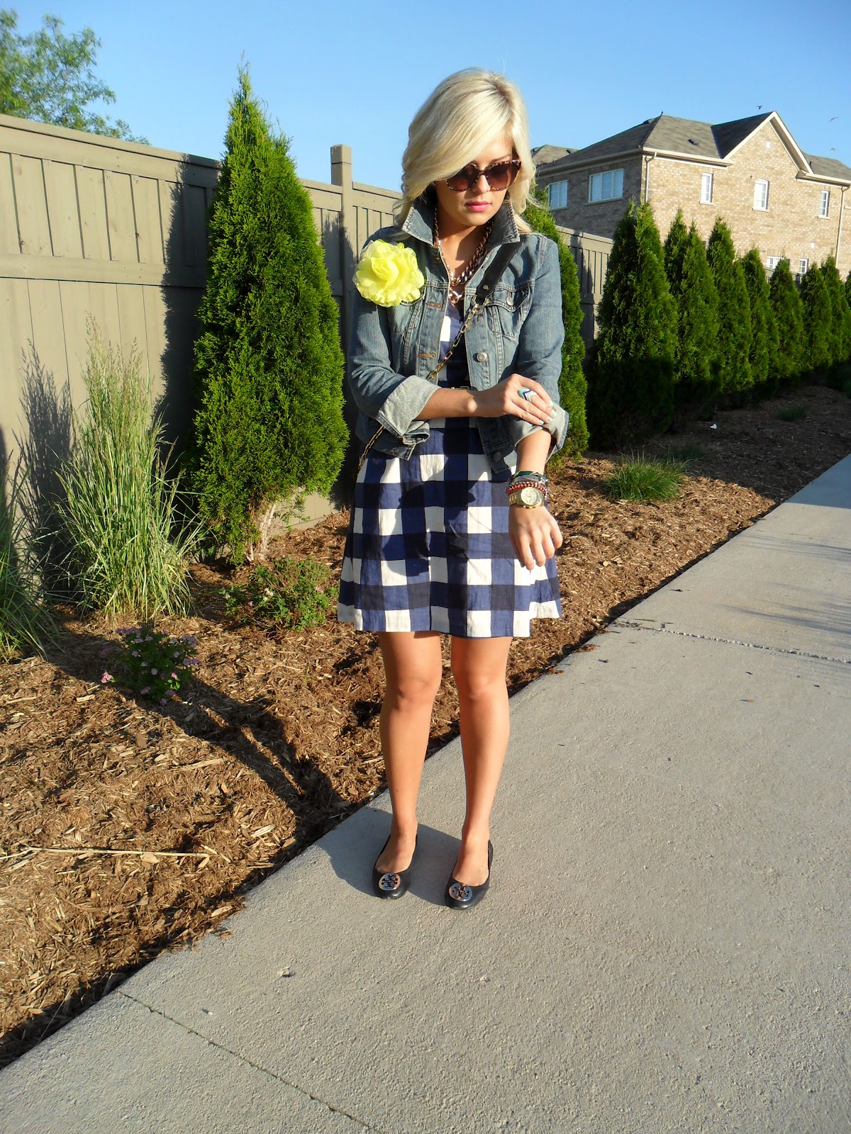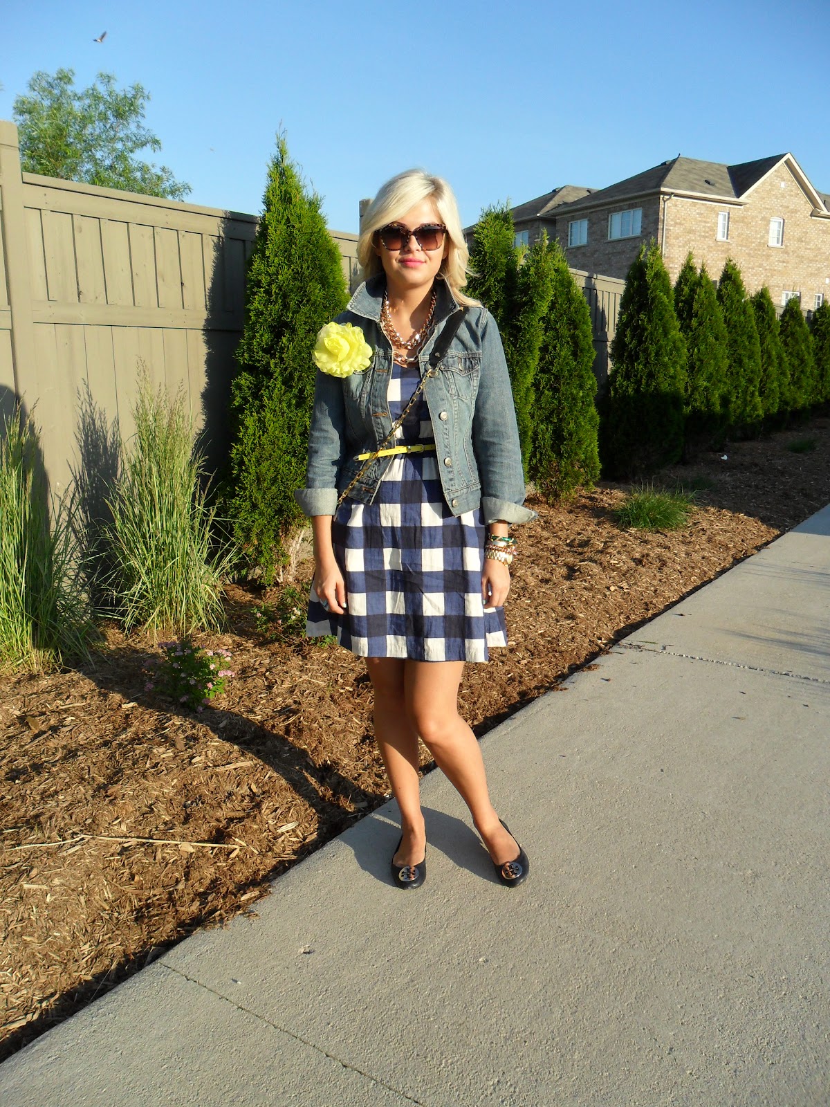Jacket: Old Navy | Dress: Gap | Belt/Floral Pin: F21 | Necklaces: See Jewelry Bag/Shoes: Tory Burch | Sunglasses: Gucci | Rings: Target | Watch: MK Bracelets: F21, Jcrew, H&M, Vintage | Nails: Essie “Turquoise & Caicos” |