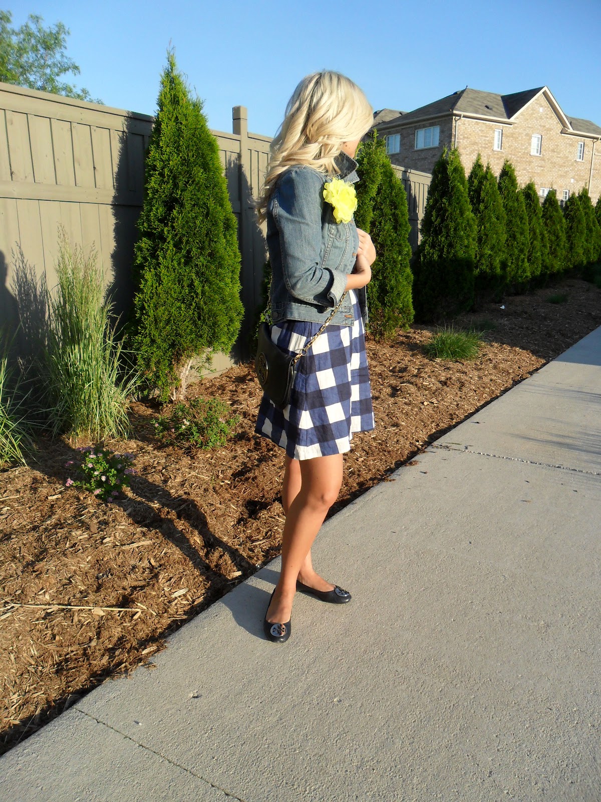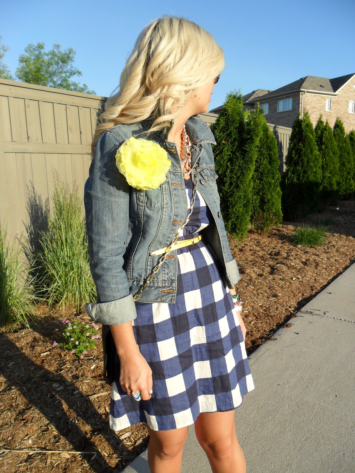| Jacket: Old Navy | Dress: Gap | Belt/Floral Pin: F21 | Necklaces: See Jewelry Bag/Shoes: Tory Burch | Sunglasses: Gucci | Rings: Target | Watch: MK Bracelets: F21, Jcrew, H&M, Vintage | Nails: Essie “Turquoise & Caicos” |