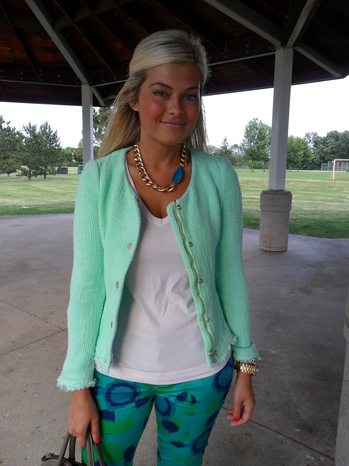 Jacket: Zara | Tshirt: Club Monaco | Pants: Joe Fresh | Shoes: Unknown {similar} Purse: Winners {similar} | Watch: MK | Bracelet: Crew Necklace: c/o Oia Jules Thanks to the Oia Jules team for this gorg necklace! xo |