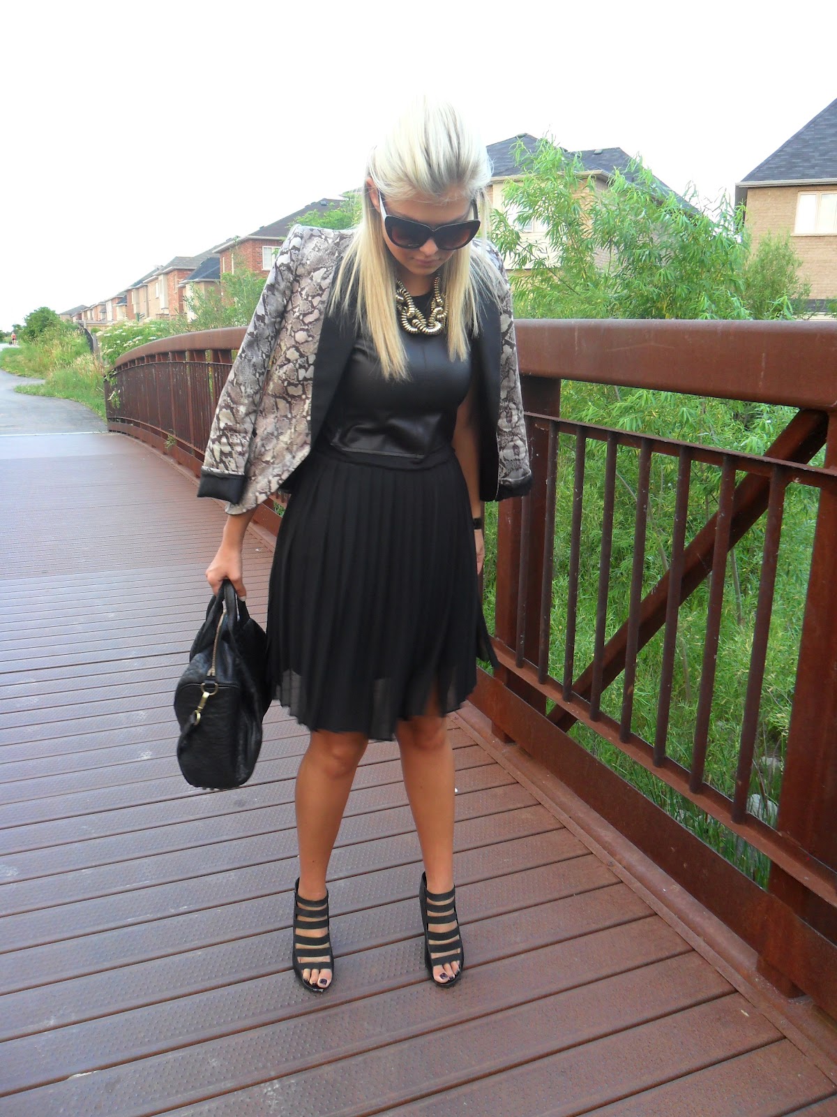 | Blazer: Zara {similar} | Dress: BCBG {old} | Shoes: Steve Madden {similar} Necklace: Hudson’s Bay Company | Bag: Alexander Wang | Sunglasses: House of Harlow | Watch: MK |