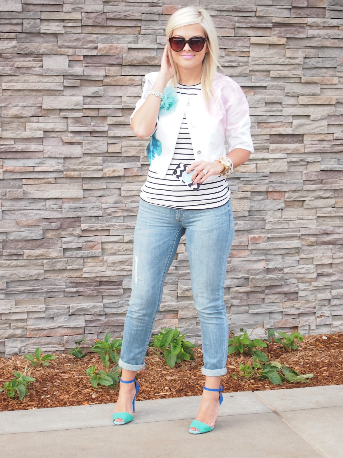 Jacket: H&M {similar} | Tshirt/Jeans: Joe | Floral Pin: F21 Shoes: Zara | Watch: Michael Kors | Sunglasses: Karen Walker Bracelets: F21, Jcrew, David Yurman, H&M | Lips: Bubble Gum by Joe |